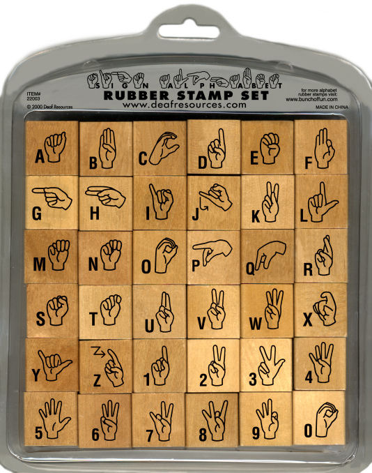 Looking for activities in your sign language classes?Want to try something different with your students? Try rubber stamping! All you need is the stamp set below, an ink pad and paper. You'll be able to make some great-looking greeting cards, wrapping paper and whatever your imagination